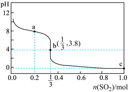 的NaClO溶液中缓慢通入SO2气体,使其充分吸收,溶液pH与通入SO2物质的量关系如图所示(忽略溶液体积的变化和NaClO、HClO的分解)。下列说法错误的是()