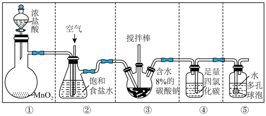 已知氯气和空气按体积比1∶3混合通入潮湿的碳酸钠中能生成Cl2O,且反应放热;不含Cl2的Cl2O易与水反应生成HClO;Cl2O在42℃以上会分解生成Cl2和O2。设计如图装置(部分夹持装置略)制备HClO,每个虚线框表示一个装置单元,其中存在错误的是()